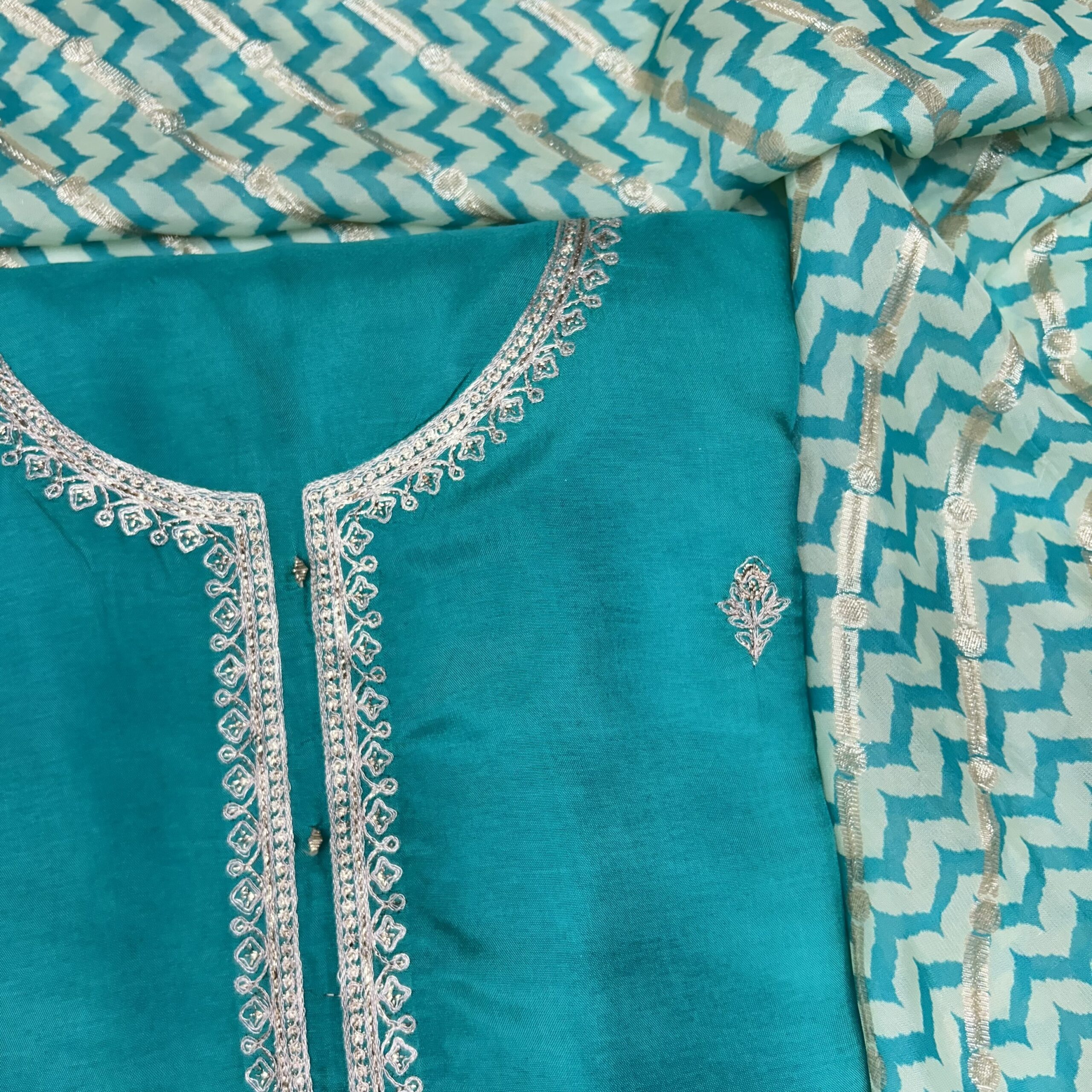 Be the first to review “EMBROIDERED SILK✨ An elegant and graceful Embroidered Silk unstitched suit set with banarasi Embroidered dupatta is a luxurious and stylish choice for any special occasion. 😍”